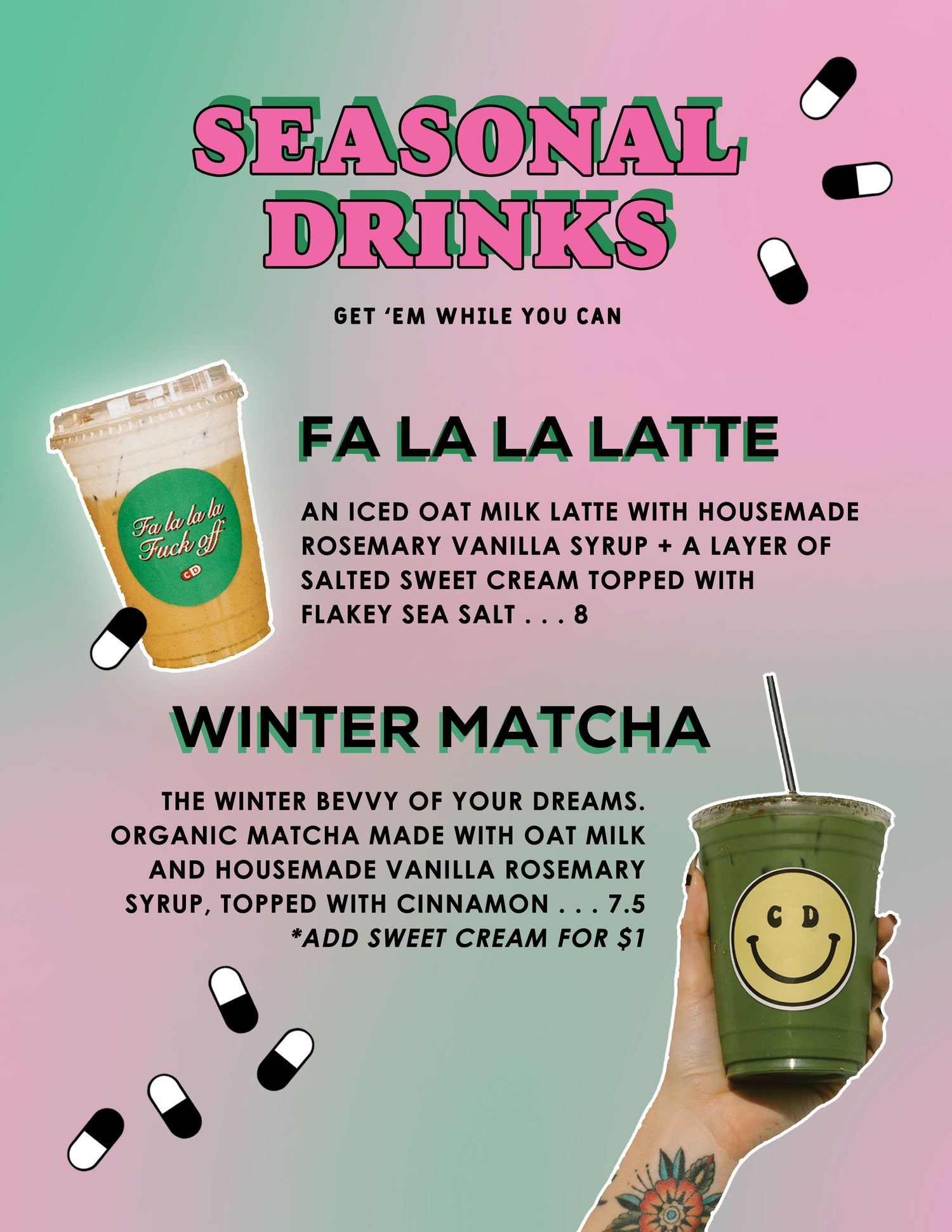 In collab with Windsor. This iced only latte is made with your choice of espresso or matcha, oat milk and housemade Earl Grey syrup.