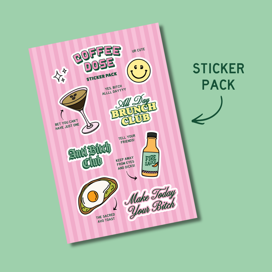 A signature Coffee Dose sticker sheet hand doodled just for you. Stick 'em on your notebooks, water bottles, or just keep it in a drawer for months on end because of sticker anxiety... whatever floats your boat.