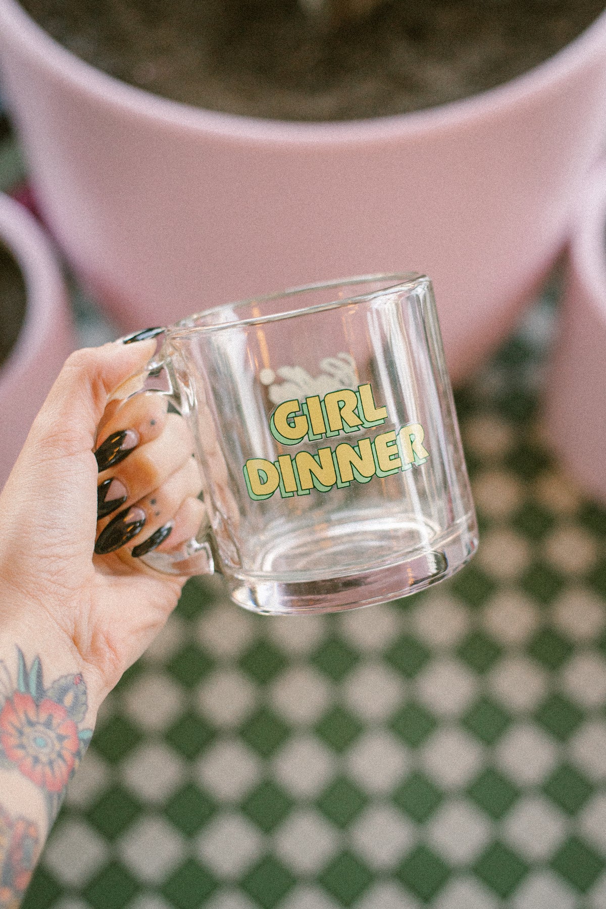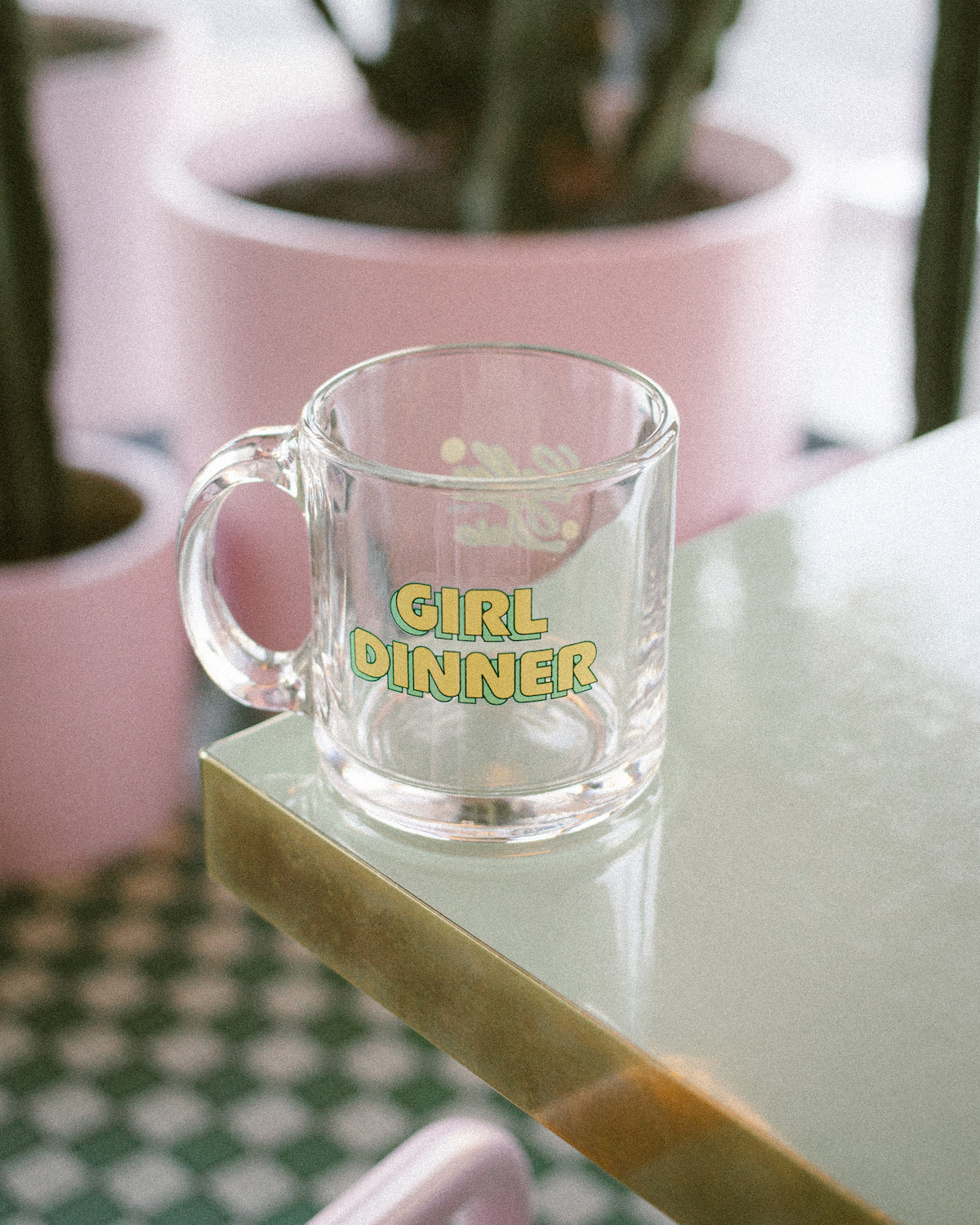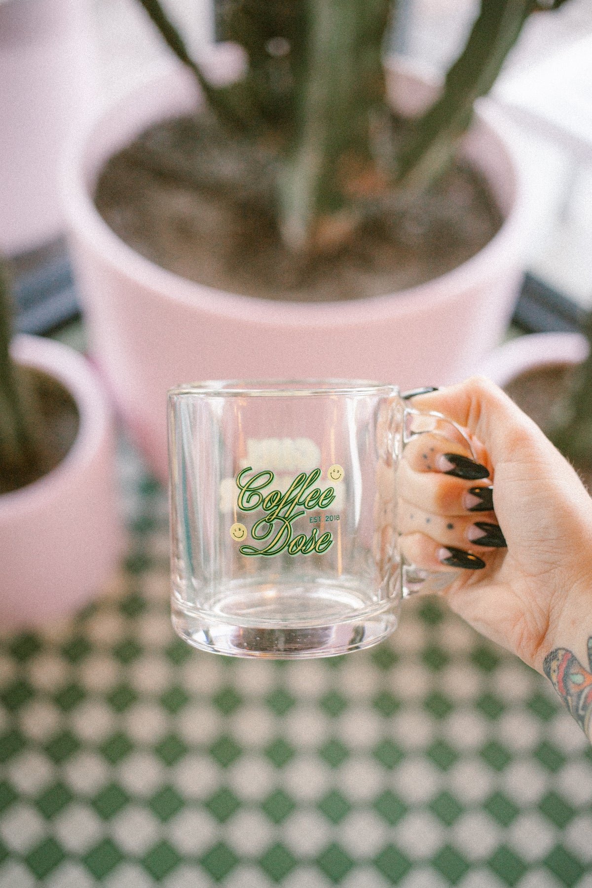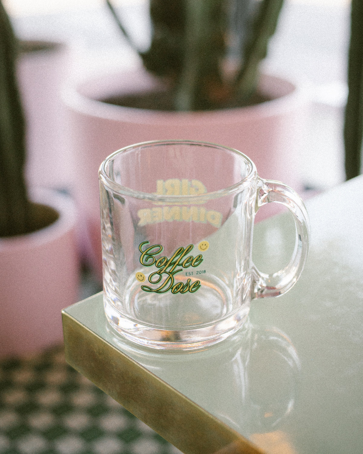 Our newest clear glass mug features a retro 'girl dinner' motif on the front with our script Dose logo on the back.